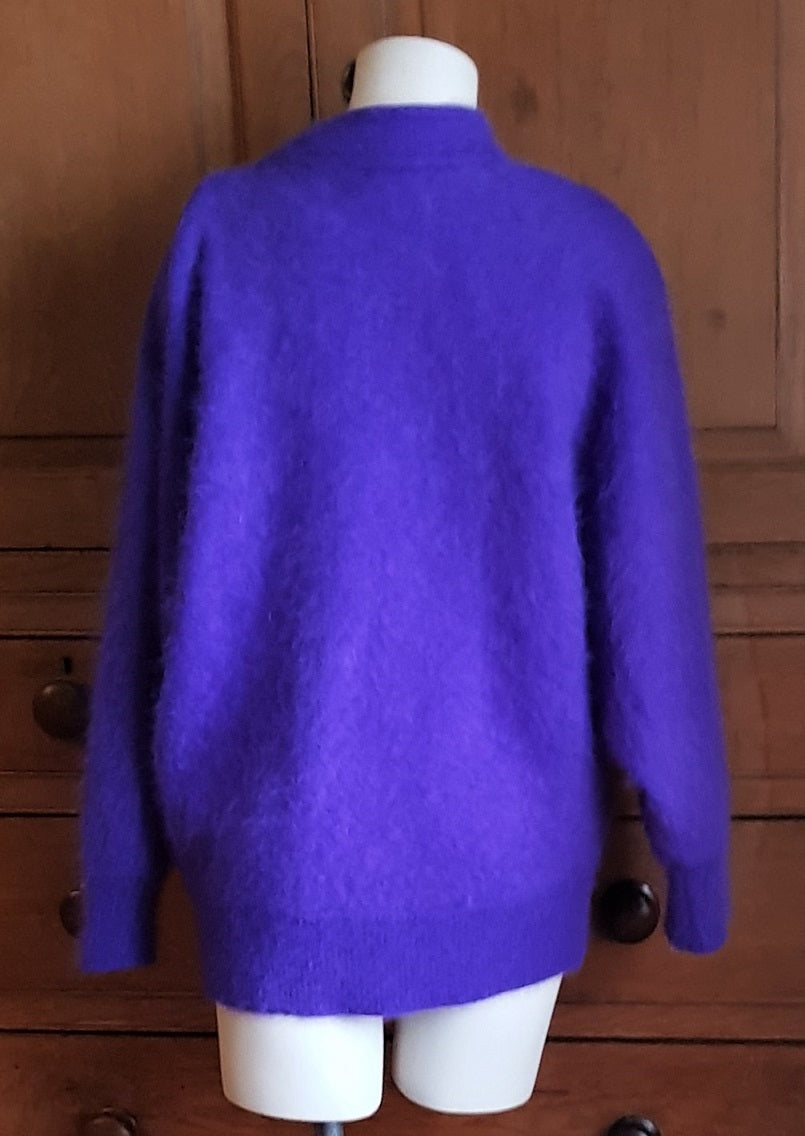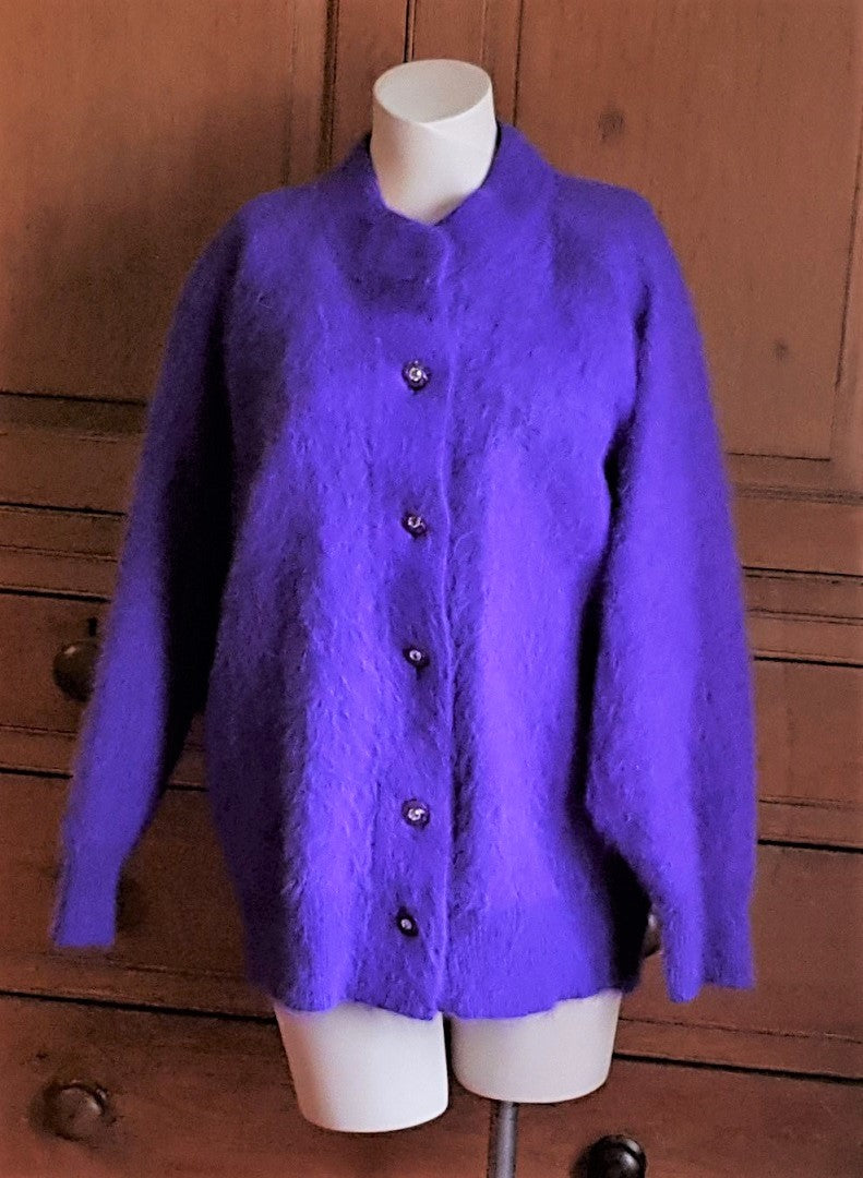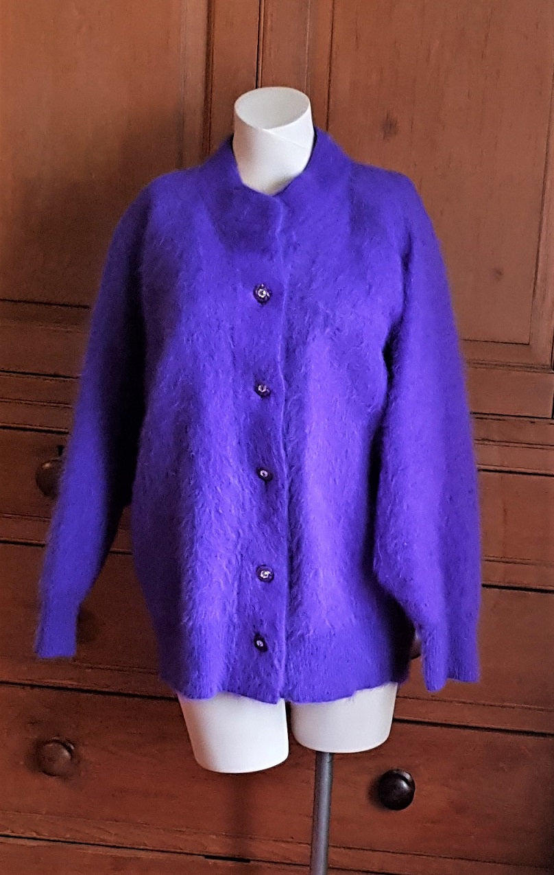 Regular price £20.00 Save £-20.00Striking 80s violet fluffy angora cardigan jacket with padded shoulders and dolman sleeves, ribbed cuffs and waist. Fully lined, fastens with five sparkly crystal buttons.