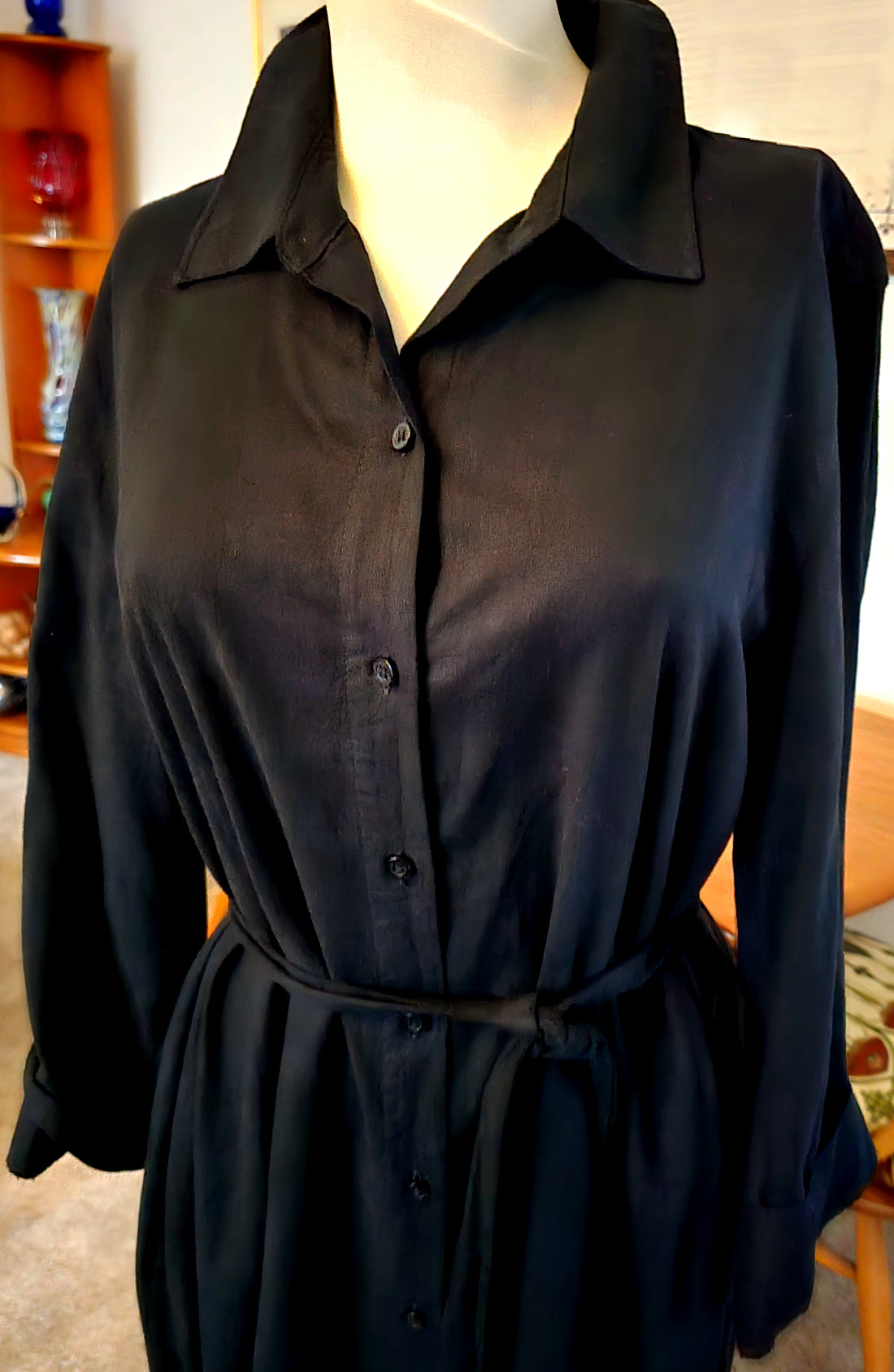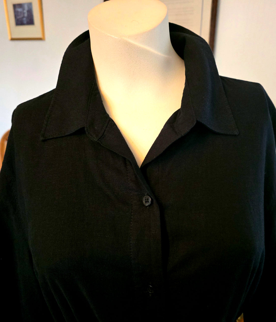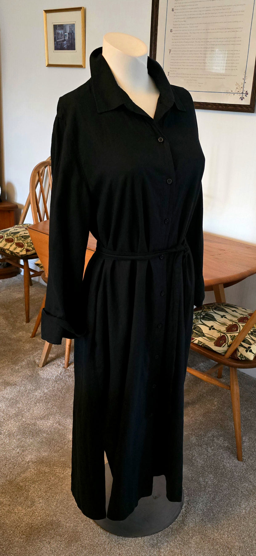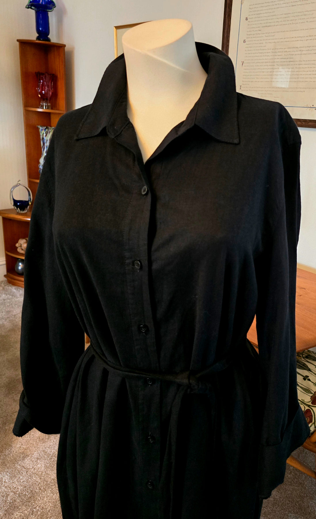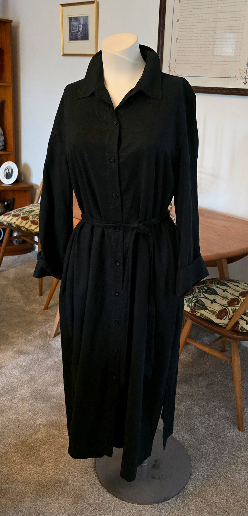 Regular price £22.00 Save £-22.00M&S black linen rich button-through longer-length shirt dress with self tying belt, long sleeves with turnback cuffs, two side pockets and deep side seam splits. Unlined.