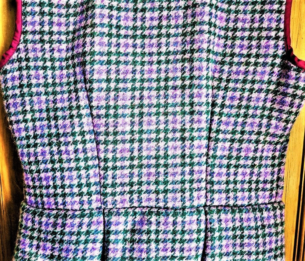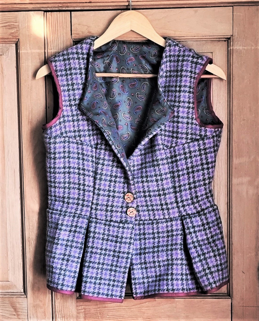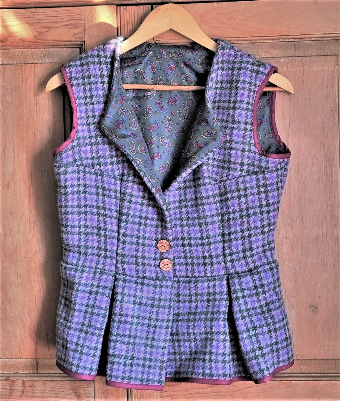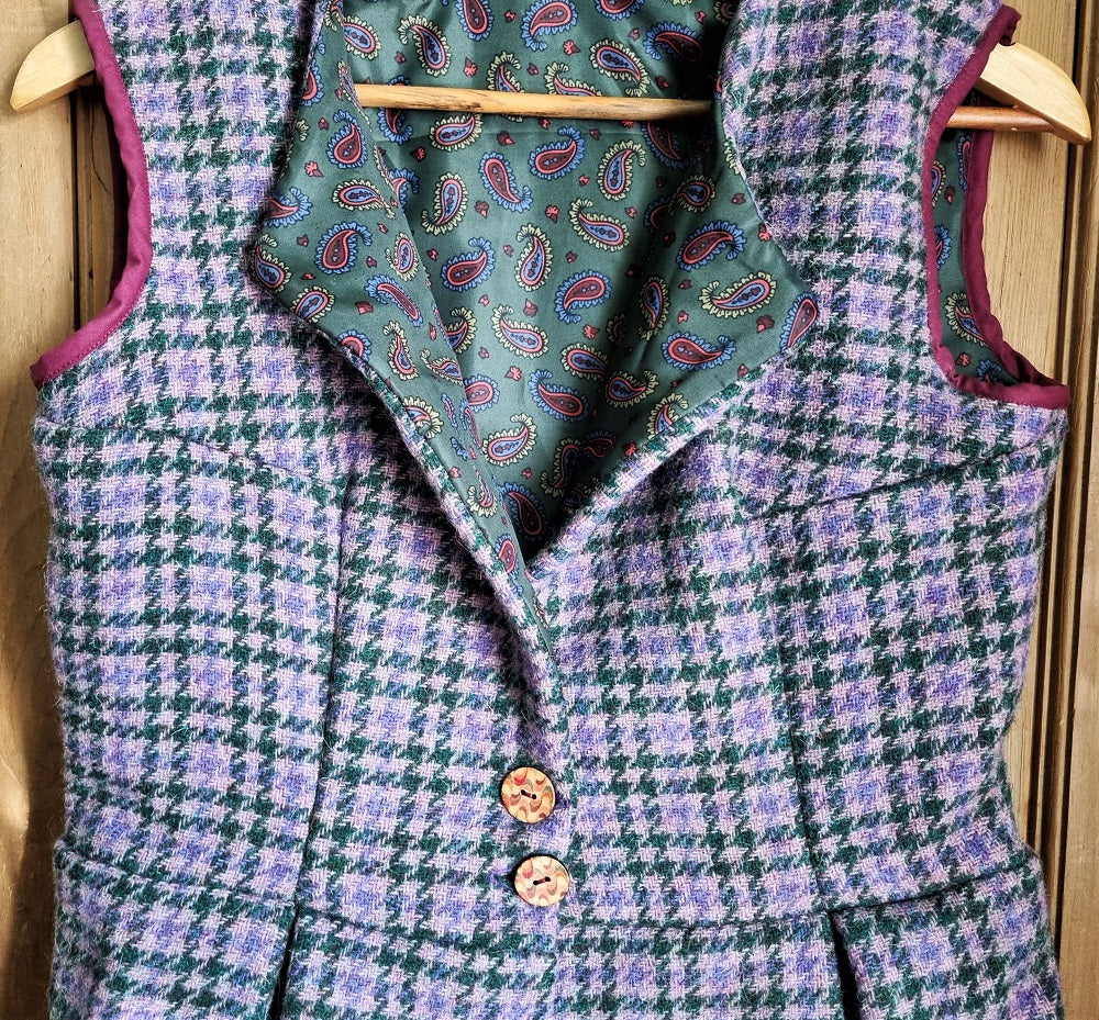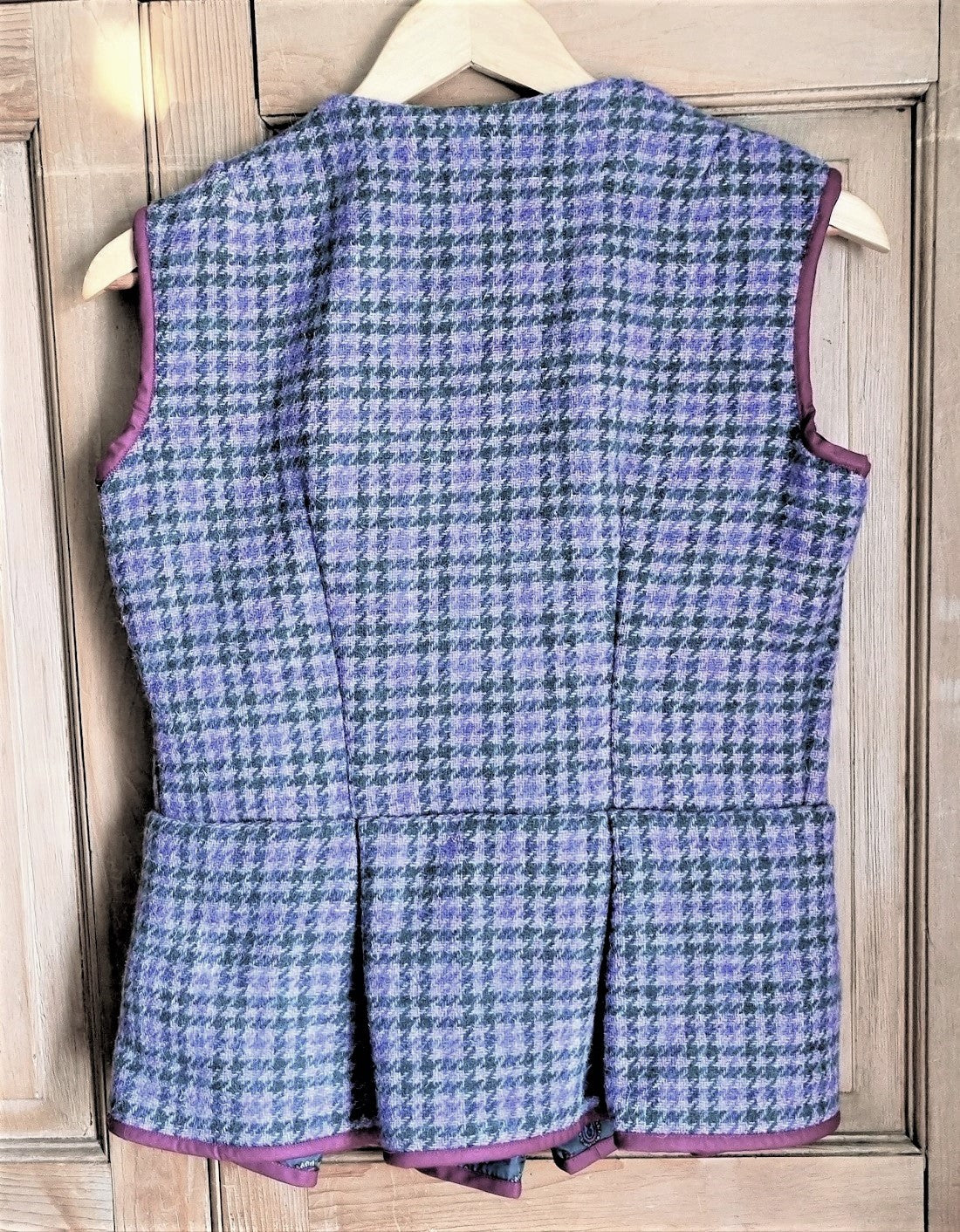 Regular price £32.00 Save £-32.00Purple heather houndstooth tweed wool waistcoat with pleated peplum and attractive green paisley pattern silky lining; fastens with two buttons. Immaculate condition.