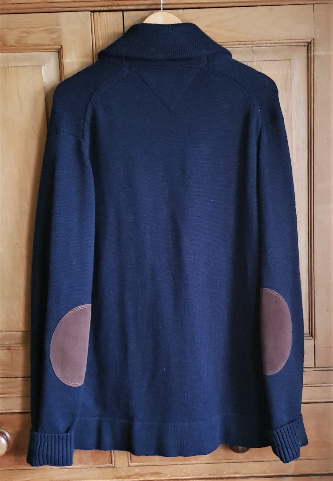 Tommy Hilfiger men’s designer navy knitted cardigan jacket with ribbed shawl collar and cuffs, rope and wooden toggle fastenings and contrast brown suede elbow patches.